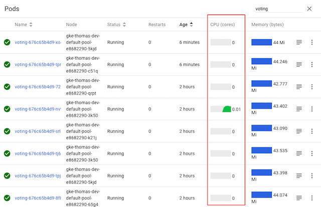 As we can see, the CPU graphs for all pods are active, indicating that all pods are now taking traffic—without having to change a line of code. Voila, gRPC load balancing as if by magic!